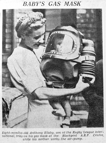 ![Eight-months-old Anthony Ellaby, son of the Rugby League international [Alfred Ellaby], tries on his gas mask at the Blackpool A.R.P. Centre, while his mother works the air-pump. West Lancashire (Blackpool) Evening Gazette, 31 Aug 1939.](images/1939-0826-blackpool-baby-gas-mask-anthony-ellaby.JPG)