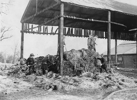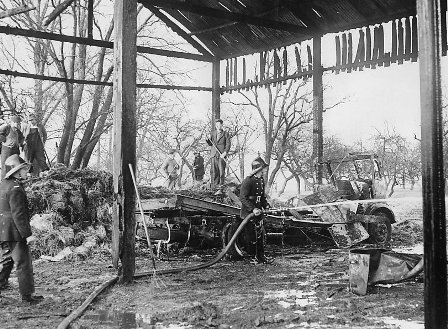 Two photos of firemen damping down after a fire Bradleys Farm, Warton, in 1956.