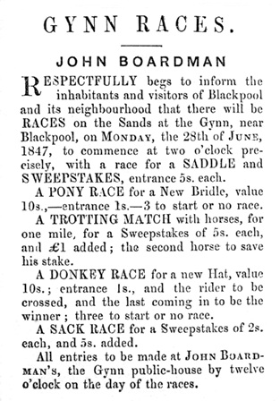 Gynn Races, Blackpool, June, 1847. Advert for a pony race, trotting race, donkey race and sack race, on the sands near the Gynn Inn, organised by the landlord, John Boardman.