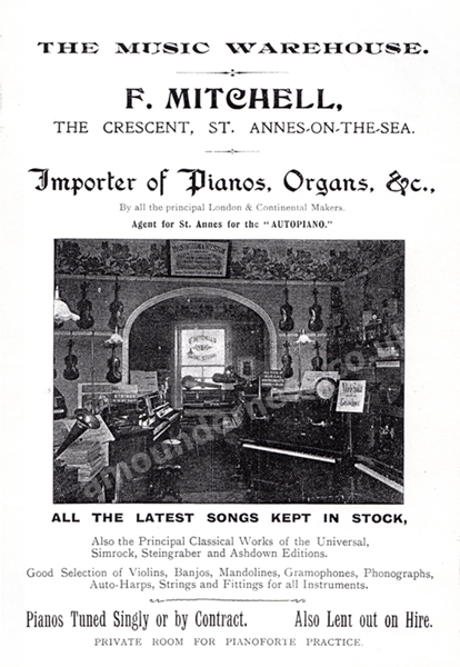 Advert from 1908 for sheet music, pianos, organs, violins, banjos, mandolins, gramophones, phonographs, auto-harps, strings and fittings for all instruments.