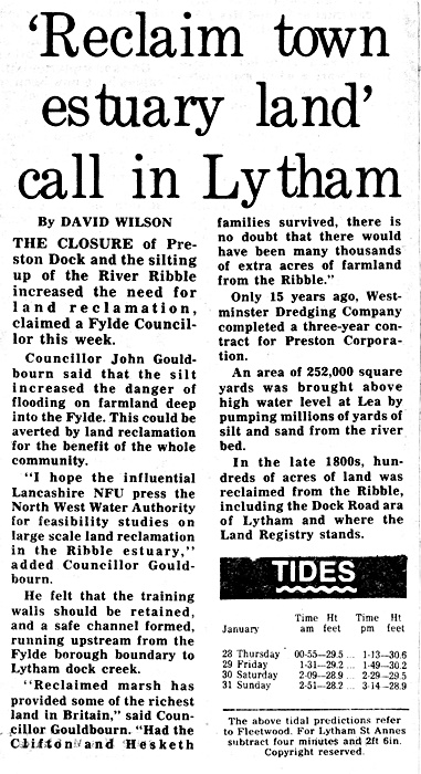A newspaper article from 1982. The Ribble estuary at Lytham, risk of flooding and land reclamation.
