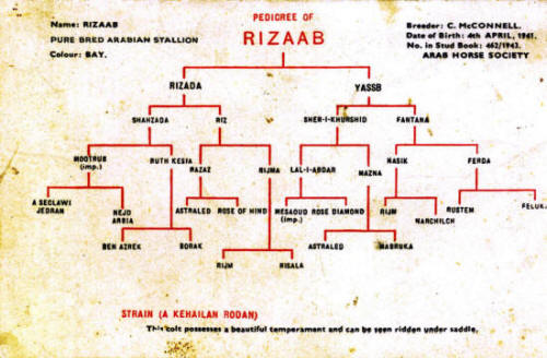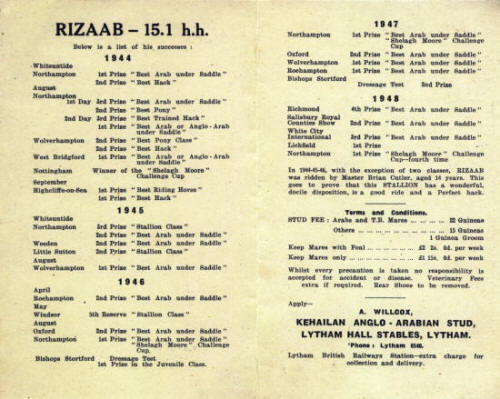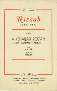 "At Stud", Rizaab, a Pure Bred Arabian Stallion, sire Yassb, out of Rizada, Lytham Hall Stables, 1941. The breeder was C.McConnel.